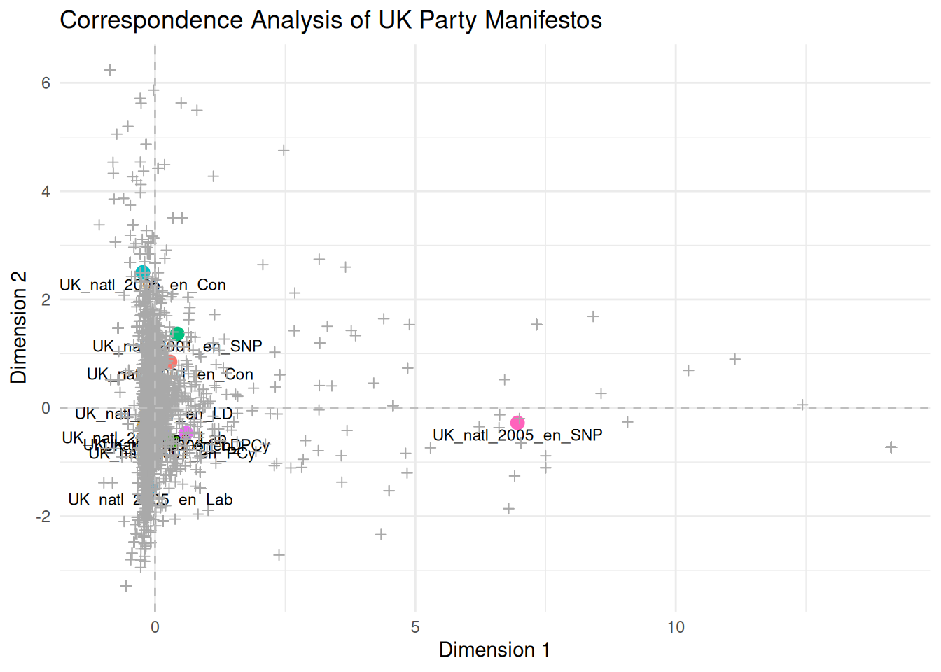 This plot illustrates the relative positions of UK party manifestos and terms extracted from the first two dimensions by SCA. Documents positioned closer together use similar vocabulary, and terms positioned closer to documents are more characteristic of them. The interpretation of the dimensions (e.g. as a left-right scale or another thematic contrast) depends on examining which documents and terms fall at the extremes of each dimension. For instance, if manifestos from left-leaning parties and terms related to social welfare appear at one end of Dimension 1 and manifestos from right-leaning parties and terms related to the economy or security appear at the other, then Dimension 1 probably represents a left-right political spectrum.