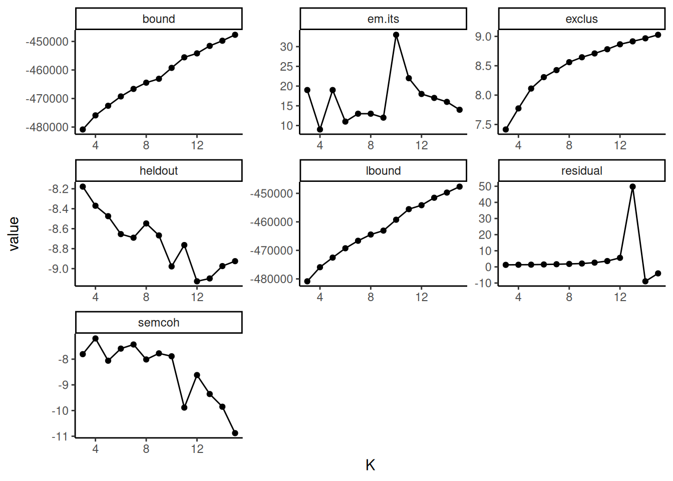 findingk <- searchK(documents, vocabulary, k, prevalence = ~Party + s(Year), data = meta,