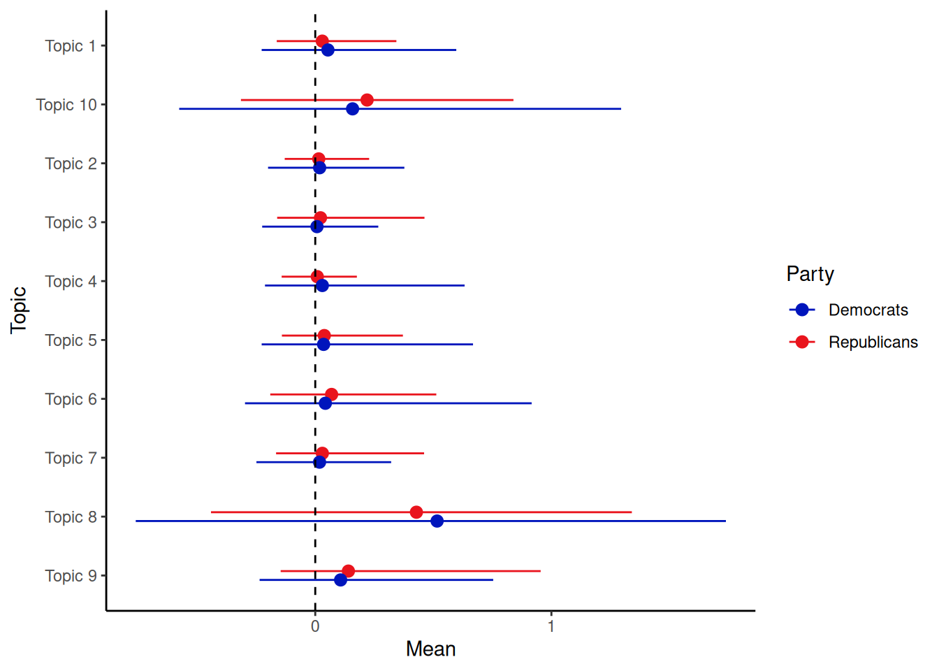 Here, we find that while the averages for the topic do seem to differ a little between both of the parties, all the intervals are overlapping, indicating that they are not that different.