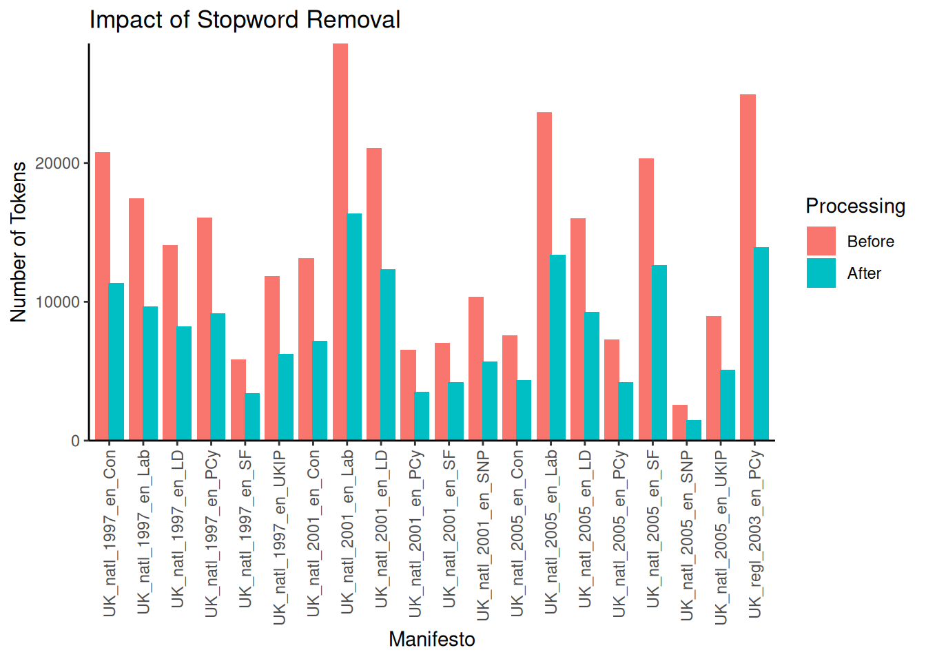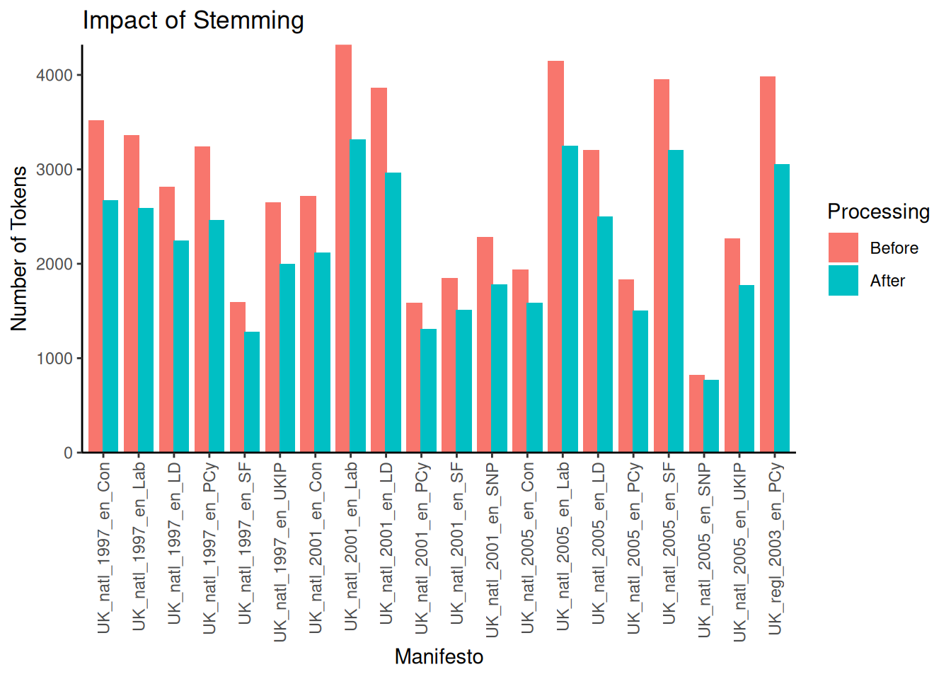Again, removing the words from their stems can remove a significant number of unique features. For example, looking at the 2001 Labour manifesto shows that from the \(4320\) types before stemming, only \(3315\) remained afterwards.