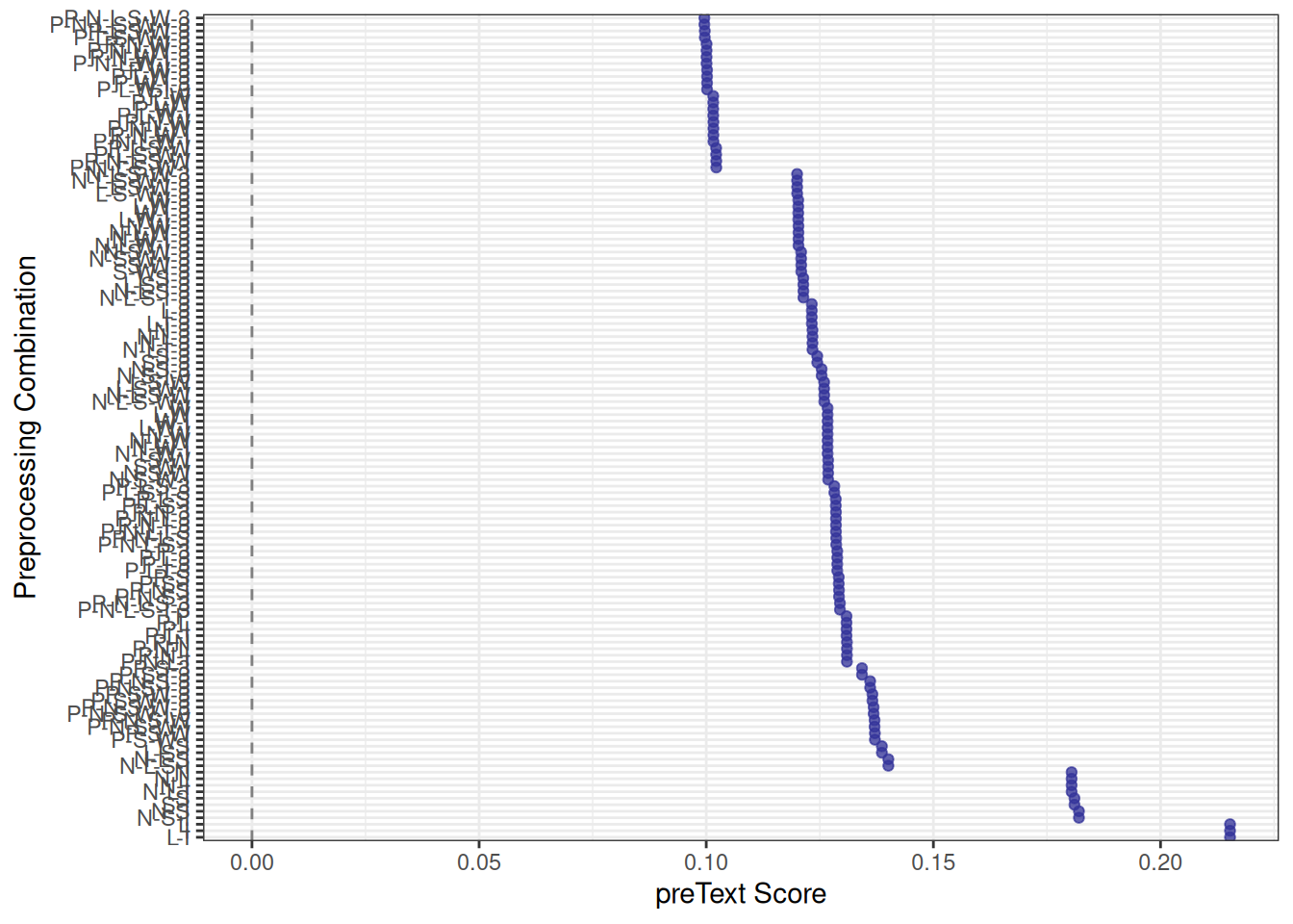 In other words, simply pre-processing our data can lead to different data sets and, therefore, to different conclusions later on during our analysis. To see what effect our pre-processing decisions had, we can use the preText package by Denny & Spirling (2018) to see what the impact of each step is on our analysis. preText works by applying all of the different possible combinations of pre-processing steps (7 in total, leading to 2⁷ = 128 possible combinations) to your corpus and then comparing the similarities between the different DFMs.