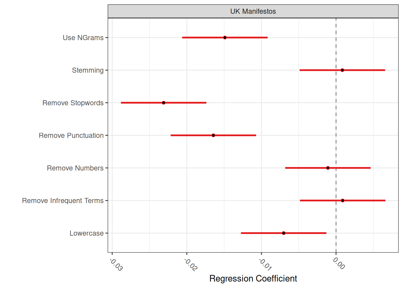 In the first plot, lower scores indicate more robust pre-processing pipelines where document similarities are less sensitive to changes. In the second plot, which is the more interesting of the two, we are looking for pre-processing steps that are significantly different from the null line. In this case, this is the use of n-grams, the removal of stopwords and punctuation and lowercasing. The fact that they are different means that this pre-processing step has led to a significantly different DFM, which is, therefore, more likely to yield significantly different results in further analyses. Note that this does not say whether this is good or bad: we might still prefer a “different” and clean DFM over an uncleaned one. The point is that we are aware of these changes and should consider the potential impacts of our pre-processing on our subsequent analysis.